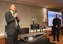 前田建設工業の手塚広明執行役員・技術担当は17日、「超小集電技術」を使った照明付きアートベンチ「レヴェイユ」のお披露目・発表イベントに参加した。ベンチは廃棄される風力発電所のブレード(羽根)を資源として再利用したもの。東京都千代田区の「大手町3×3Lab Future」で同日から展示を始めた。