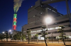 相馬共同火力発電(福島県相馬市、内海博社長)は23日、新地発電所1、2号機がそれぞれ営業運転開始から30年を迎えたことから地域へ感謝の思いを込め、煙突のライトアップを始めた=写真。1、2号機ともに出力100万キロワットと、単機としては国内最大級の石炭火力。東日本大震災と2度にわたる福島県沖地震で大きな被害を受けるなどしたが、苦難を乗り越え電力の安定供給を支えてきた。同日、現地で地元関係者らを招き点灯式が行われた。