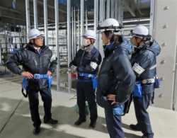 安全パトロールを行った山崎社長(左)。作業内容の説明を受けながら安全確保の状況などを確認した(富山県入善町) 北陸電気工事の山崎勇志社長は、冬季特別安全活動の一環として、富山県内の工事現場を対象とした安全パトロールを実施した。いずれも入善町の空調管工事と内線工事の現場を視察。山崎社長は、どの現場も複数の工事業者が並行して作業を進めていることに言及。「様々な業者が現場に入ると作業スペース、資機材の置き場所確保などの調整が重要になってくる」として、事業者間の調整に配慮し、安全確保に努めるよう要請した。