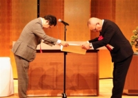 山田審議官(左)から顕彰状を受け取る高橋氏