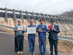 大井ダムが「放流賞」を受賞した(左から、くりさん、前田所長、平井所長代理、鷲見さん)