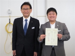 沢田社長(左)から認定証を受け取り、笑顔をみせる遠藤さん