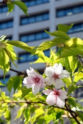 経済産業省(東京・霞が関)の中庭で、福島県浪江町で育てられ移植された桜が今年咲いた=写真(12日撮影)。品種は早咲きの大漁桜(たいりょうざくら)で、同省によると植樹後初めての開花。3月初旬には40~50輪ほどが咲いたという。