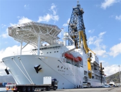 北海道日高沖で天然ガスの試掘調査を行うJAMSTECの探査船「ちきゅう」