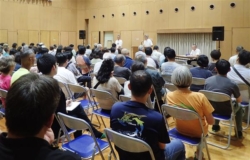 13日夕、父島で開かれた村長の考えを伝える説明会。父島では115人、母島では42人が出席した 高レベル放射性廃棄物の地層処分に関する南鳥島を対象とした国の文献調査申し入れを巡り、小笠原村の渋谷正昭村長は13日、自らの考えを村民に伝える説明会を父島と母島で開いた。渋谷村長は村内外からの意見を踏まえた上で「国が文献調査を実施するか否かを判断するべき」と回答する意向を示した。渋谷村長は説明会後に報道陣の取材に応じ「国が実施を判断するのであれば、その判断を受け入れる」と述べ、村民の理解や議論を深める場や他自治体への申し入れ拡大などを要請する考えを示した。