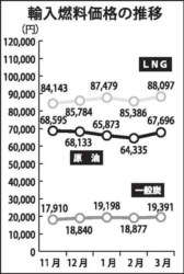 貿易統計3月、原油輸入単価5%高/6月分規制料金、東京は小幅高試算