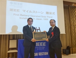 贈呈式で福田会長(右)から阿部常務が銘板を受け取った 東北電力ネットワークは22日、福島市の信夫山にかつて設置した「信夫山移動無線中継所」が電気・電子・通信分野の歴史的偉業をたたえる「IEEEマイルストーン」に認定され、銘板の贈呈を受けたと発表した。贈呈式が仙台市内で21日に開かれ、2020年度IEEE会長の福田敏男氏から同社の阿部公哉常務取締役が銘板を受け取った。