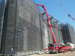 新企業センター建設現場でのコンクリートポンプ車を使った工事(3月17日、福島県富岡町) 東京電力福島第二原子力発電所(福島県楢葉町、富岡町)の廃炉作業が間もなく、着手から5年を迎える。現在は解体工事の準備期間中。原子炉建屋を解体する前には、建屋内の使用済み燃料プールから燃料を全て取り出す必要がある。発電所内では、使用済み燃料を収納する金属容器(キャスク)の製造工場の建設工事と、使用済み燃料の乾式貯蔵施設の建設準備も進む。