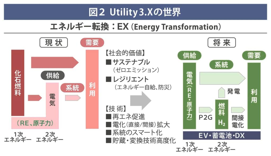 Utility3.Xの世界では、現在の化石燃料(一次エネルギー)から電力を生産(二次エネルギー)するというエネルギーフローから、再生可能エネルギーを主体としたカーボンフリー電源が起点(一次エネルギー)となり、その電力から水素などの非化石燃料が製造(二次エネルギー)されるというエネルギーフローの転換EXが起こることになる=図1。