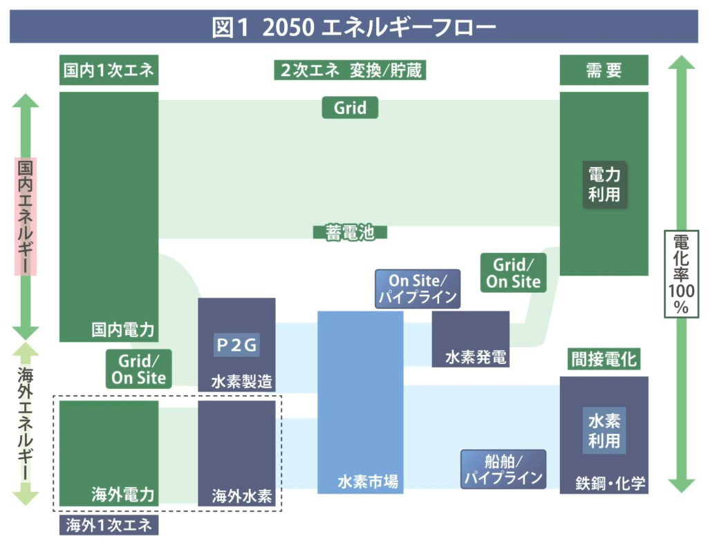 電源側では再生可能エネルギーコストの削減、特にポテンシャルの大きな浮体式洋上風力のコストダウンがキーとなる。需要側では、サステナブルに脱炭素化を進めるためには、電化の進展が重要になるが、高温熱需要のような電化が経済的に難しい領域などに対しては、グリーン水素のような再生可能エネルギー電力由来のカーボンフリー燃料の利用(間接電化)といった技術が有効となる。
