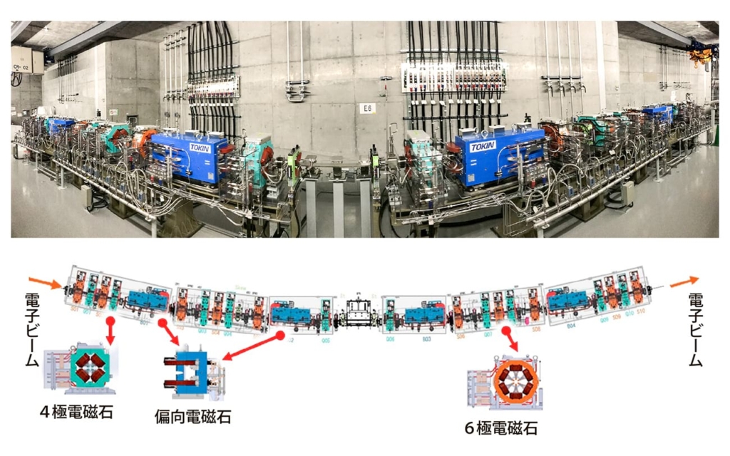 上空から見て反時計回りに進む電子ビームの理想軌道は、軌道面の下にN極、上にS極を持つ偏向磁石が、電子に軌道中心方向の力を与えて形成される。さらに、理想軌道の外側に小さな偏向磁石と内側に上下反転対称の偏向磁石を持つ四極磁石が、理想軌道から外れた電子を元に戻す力を与えることにより、電子ビームを理想軌道周辺に閉じ込める。多重の偏向(Multi―Bend)磁石と多極(四極)磁石配列による閉じ込め効果と、色収差をなくす配列間のアクロマート(Achromat)が「MBA磁石配列」を構成し、従来技術で達成不可能であった楕円断面積圧縮、すなわち高密度電子ビームを実現した。電子ビームの楕円断面サイズは長軸が髪の毛の太さ程の0.12ミリメートル、短軸はその20分の1である。