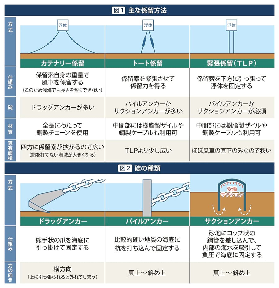 浮体式洋上風車は、勝手に流れていかないように、しっかり碇(いかり)で所定の位置に係留しないといけない。係留方法は、設置地域の水深、海底の地質(砂か岩か)、浮体の大きさ、潮流の強さ、等を考慮して選定する=図1。係留方法に応じて、使用する碇の形式も変わってくる=図2。1万キロワット級の数千トンの浮体を係留するには、直径10センチメートルを越える太い鋼鉄製の棒を曲げて作ったチェーンで3~9本分が必要である。係留索全体の重量と費用は1万キロワットの浮体1基当たりで数百トン・数億円に上る。
