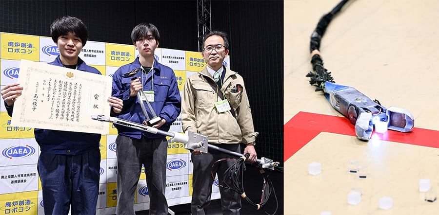 最優秀賞(文部科学大臣賞)を獲得した小山高専(写真左から舟田悠太郎さん、星野怜生さん、指導教員の田中昭雄さん)。「ロボットさえ小さく作ってしまえば直線的なアプローチができる」と「小口径配管」からのアクセスを選択した。今回、サンプルを回収して戻ってくるまでの課題を完遂した唯一のチームとなった。右の写真は、競技中にサンプルを回収する小山高専のロボット。先端のカメラの体積が大きく、他の部品や回路などを収めるのに苦労したという。またロボットが小さいと、配線を引っ張る力が弱いのが難点だった。小山高専は、配線の回りに突起物をつけ、さらに振動する機能を持たせるなど、抵抗を減らす工夫も組み込んだ。