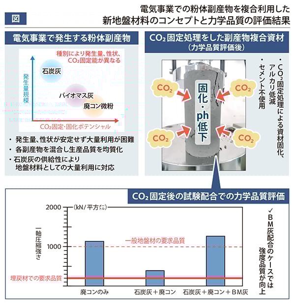 第2回で紹介したように、石炭灰は、1トン当たり平均約6.3キログラムのCO2を固定する能力があると推定されるが、同じく塩基性の粉体副産物であるバイオマス専焼灰や廃コンクリート微粉は、炭酸塩化の源となる消石灰などの成分に富むため、トン当たり石炭灰の数倍以上のCO2が固定可能である。しかしながら、石炭灰は年間約1300万トン発生しているが、バイオマス専焼灰や廃コンクリート微粉の発生量はその五十分の一前後と試算され、品質も安定的ではないため、優秀なCO2固定能を生かした活用ができていない現状がある。電力中央研究所では、石炭灰を主成分に電気事業で発生したバイオマス専焼灰や廃コンクリート微粉を混和し、性状の均質化を図ったセメント不使用の地盤材料の開発に取り組んでいる。上記3種の副産物のみ配合したモデル資材では、想定用途で要求される力学品質や環境安全性を満たし、資材トン当たり最大約23キログラムのCO2を固定する能力があることを明らかにした。