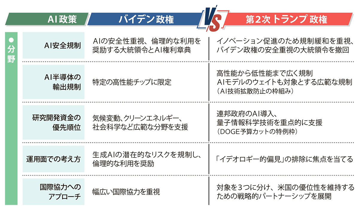 米国では生成AI(人工知能)が大きなブームとなり、企業は設備投資やサービス開発に注力している。米電力業界は、巨大AIデータセンター向け電力調達に奔走している。トランプ大統領はAI大統領令(14179号)を1月に出し、4月には行政管理予算局(OMB)が「イノベーション、ガバナンス、国民の信頼を通じた連邦政府のAI利用促進」および「政府における人工知能の効率的な調達」という2つの覚書を発表するなど、AI強化で活発に動いている。しかし、AIを巡る中国との覇権争いは厳しさを増しており、政策の成否が問われつつある。