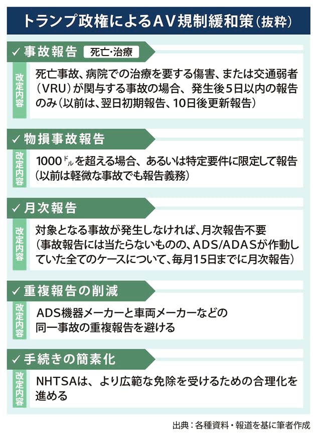 米国政府のAV振興策は2017年9月にNHTSA(米国道路安全局)が発行したADS2.0(自動運転システム2.0)から活発化し、20年にはAV4.0で、安全優先や効率的な市場形成などの指針を発表してきた。これらはAV開発を安全面から規制する姿勢が強かった。