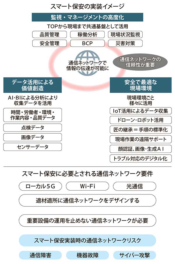 ◆スマート保安 デジタル技術を用いて社会インフラ設備の保守・監視を高度化する取り組みを指す。従来は作業員による巡視や点検が主流であったが、IoTセンサーやカメラ、AI分析を活用することで、遠隔から常時監視が可能となり、異常の早期検知や人的ミスの削減が期待される。さらに収集したデータを経営層が活用することで、保守計画の最適化やコスト削減にも寄与する。電力をはじめ各インフラ分野で導入が進む新たな保安体制である。