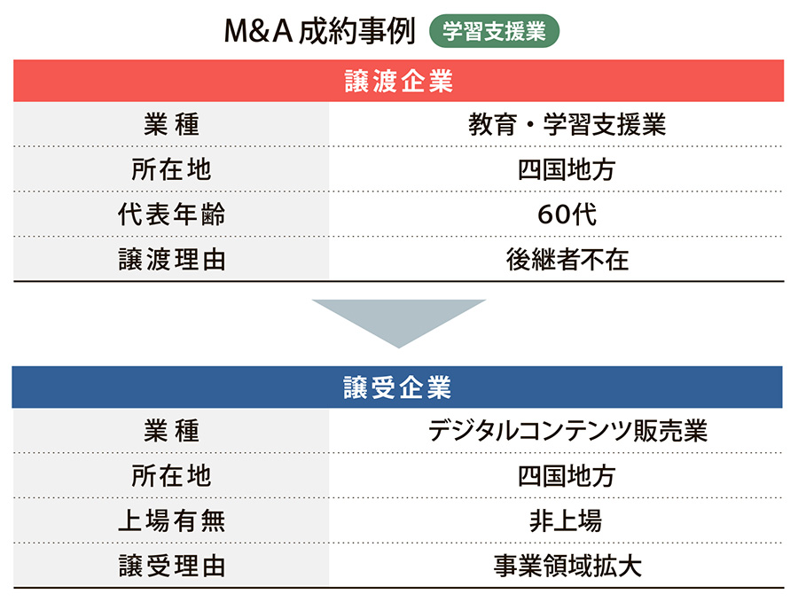 あらゆる業界でDX(デジタルトランスフォーメーション)推進の波が広がるなか、M&A(企業の合併・買収)を活用しDX推進を図る事例が増加しており、教育分野においてもデジタル技術を取り入れた新たな成長戦略が求められている。本稿では、譲渡企業のマーケティングDXにM&Aを活用した事例を紹介する。四国地方で英会話スクールの運営や法人研修を手掛ける譲渡企業と、同じく四国地方でSNSを活用したデジタルコンテンツ販売を強みとする譲受企業のM&A事例である。