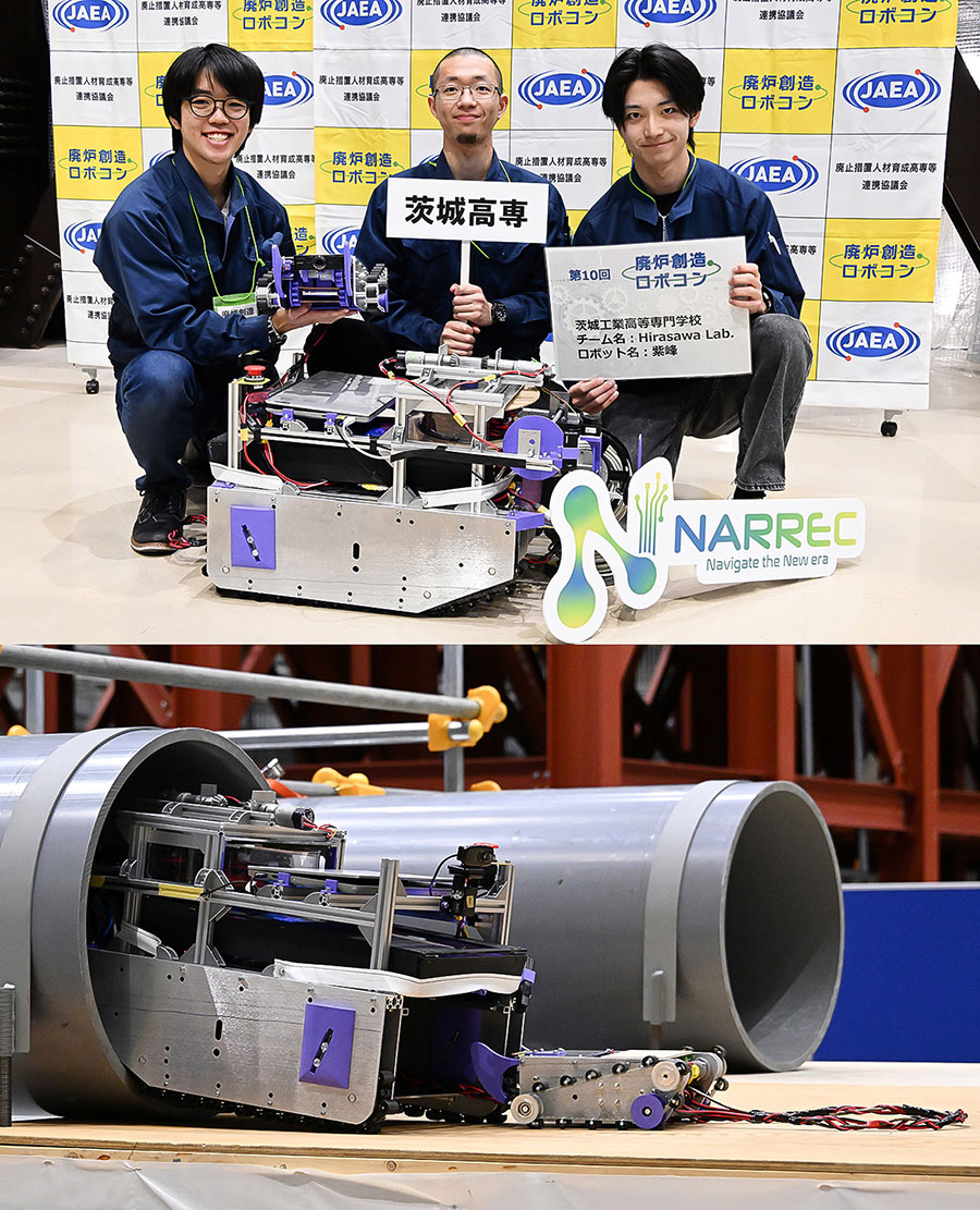 トップバッターで競技に挑んだ茨城高専。リーダーの根津佑さんは開会式で選手宣誓も行った。プレッシャーにさらされる中でも、速やかに階段を降り、対象物を回収。階段の登りも順調にクリアし、観客を沸かせた。貫通孔前に到着した時には約半分の競技時間を残していたが、惜しくも通過に手間取ってしまった。筒の前で子機を出動させ親機を押すなど、なんとか通過しようと試みる姿にも、諦めない姿勢とトラブルへの対応力が垣間見えていた。次点の優秀賞を獲得した。