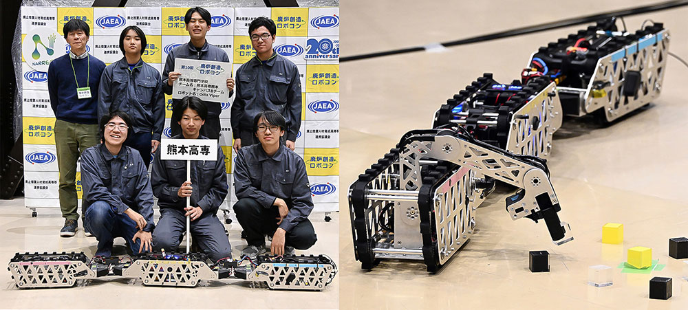 廃炉創造ロボコン経験者の多い熊本高専熊本キャンパスBチームは前回に引き続き蛇型ロボットで挑んだ。関節数を増やし3列に強化。制御系にも力を入れ、デブリをつかみ取る機構は自動にして時間節約を目指した。関節の数が多くなると操縦の難易度も高くなりそうだが、ロボットの製作は夏休み中に終え、練習機会を増やしたという。競技ではデブリを回収し、もう一息のところまで階段を上った。十分実力を見せ、技術賞を獲得した。