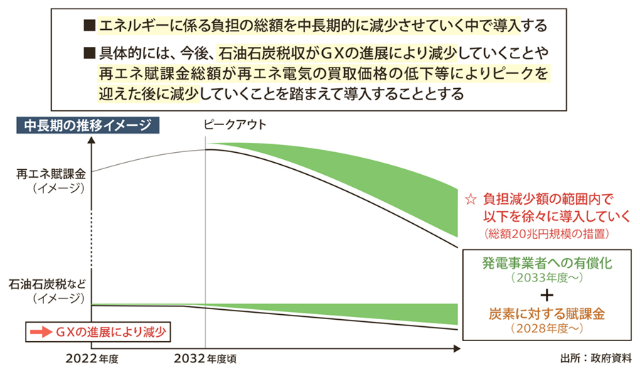 ・上限価格…成長志向型カーボンプライシングは、経済への影響を考慮し、エネルギーに係る負担の総額を中長期的に減少させていく中で導入するとされる。具体的には、化石燃料賦課金は石油石炭税収がGXの進展によって22年度をピークに減少していくことを、特定事業者負担金は再エネ電気の買取に係る納付金(再エネ賦課金)が買取価格の低下などにより33年度以降減少していくことを想定し、炭素価格の負担がこれらの減少幅以下に収まるよう、上限が定められている。