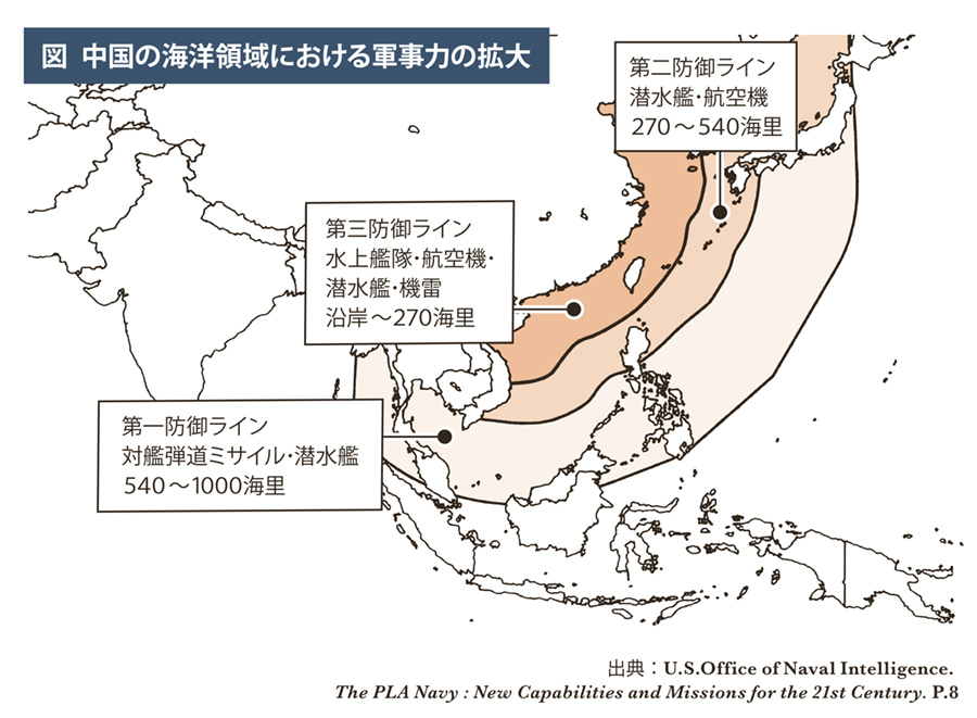 中国の軍事力に関して付言すると、「アクセス阻止・エリア拒否戦略」(A2/AD戦略=Anti―Access/Area―Denial Strategy)と呼ばれるPLAの軍事戦略は急激な近代化と能力の拡大が継続している。図(左上)は米海軍情報部が15年に公表した、PLAの海洋領域における軍事力の拡大を示したイメージを拙著『海洋戦略論』で引用したものである。