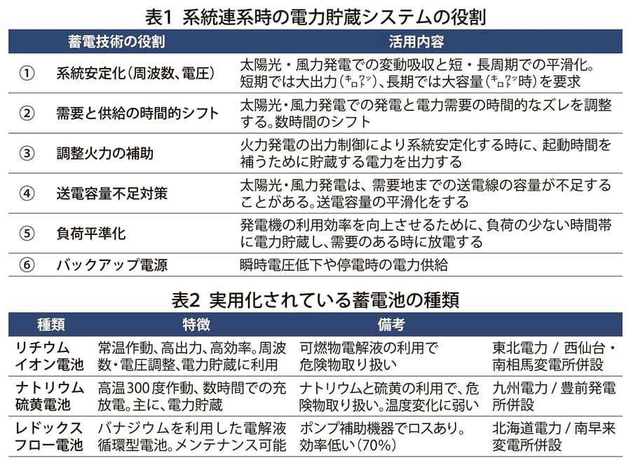 しかし、これらの電源は、「お天気任せ、風任せ」の発電で、その時の天候状況により発電量は変動する。需要の有無にはお構いなしに、発電したり、止まったりする、自分勝手な電源である。これらの不安定な電源を連系する系統の安定化のために、電力貯蔵システムが活用されている=表1。