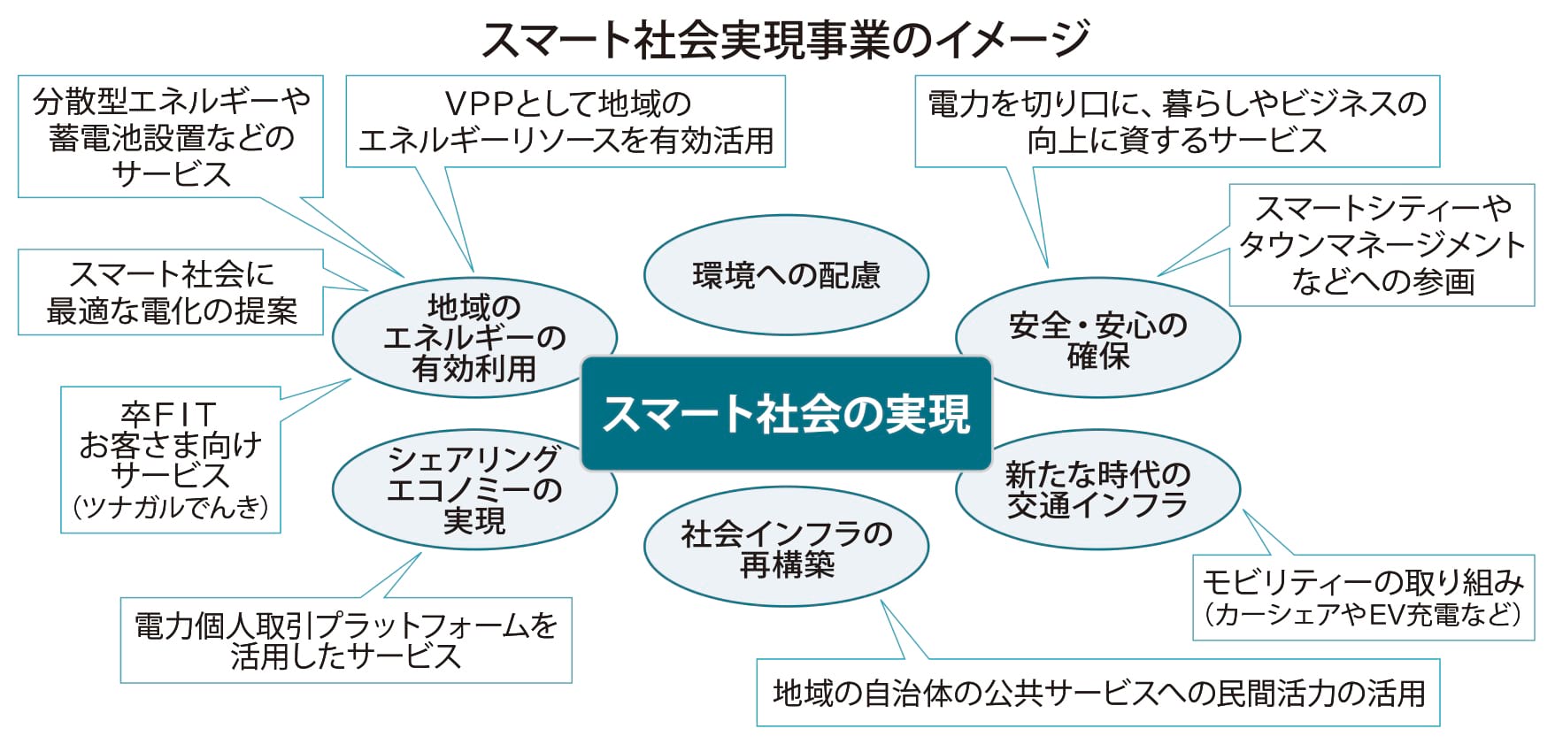 東北電力では「スマート社会」を「地域における人口減少や少子高齢化により、交通、教育、福祉等様々な分野で顕在化する社会課題を、次世代のデジタル技術やイノベーションの活用等により解決し、地域に住む方々が快適・安全・安心に暮らすことができる社会」と定義している。「スマート社会」の実現に向けた事業として、具体的には「カーシェアやEV充電などのモビリティサービス」、「見守りなどの生活関連サービス」、「VPPとしての地域のエネルギーリソースの有効活用」、「分散型エネルギーや蓄電池等の設置サービス」、さらにこれらのサービスをトータルで提供する「タウンマネジメント」などを想定している。